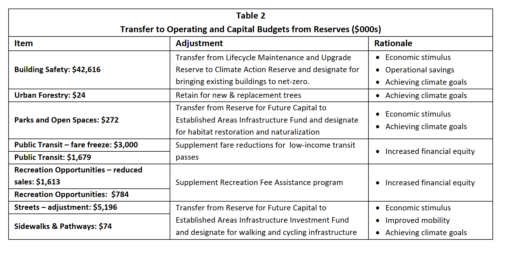 Re-direct the money listed in Table 2 to strengthen and enhance the City’s work on climate, improved mobility, and aiding the most vulnerable. Fund those measures using money from the reserves specified or a combination of: